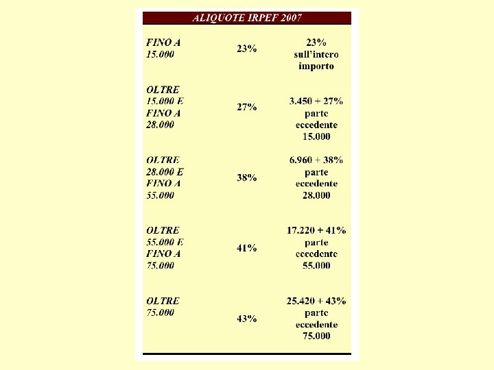 CALCOLO SEMPLIFICATO DELL'IRPEF MENSILE 2007 Reddito imponibile Aliquota Imposta lorda Fino a 1. 250, 00 € 23 % 23% sull’intero importo Da 1. 251, 00 a 2. 333, 33 € 27 % 287, 50 € + 27 % l’eccedente 1. 250, 00 Da 2. 333, 33 a 4. 583, 33 € 38 % 580 € + 31 % l’eccedente € 2. 333, 33 €