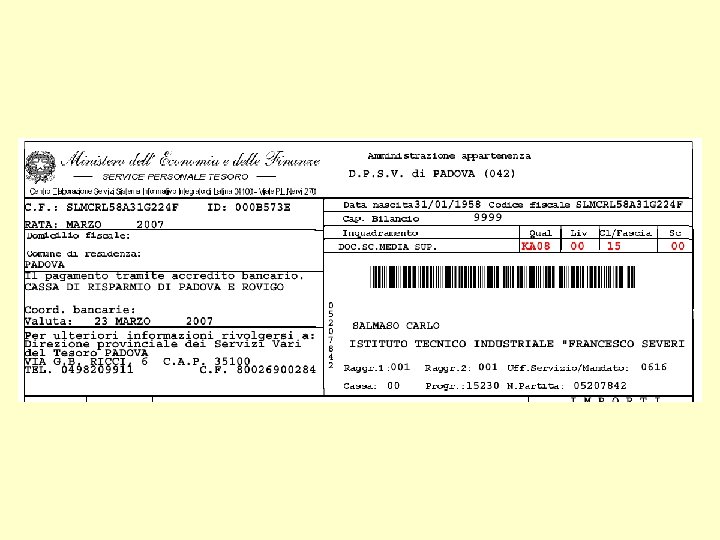 • Numero Partita = è il numero identificativo di Partita di Spesa Fissa del dipendente. È importante indicare tale numero identificativo ogni volta che si debba comunicare con l’ufficio che gestisce il trattamento economico (DPSV) o fornirlo quando si chiedano notizie sull’andamento dei pagamenti perché insieme al codice fiscale rappresenta la chiave di ricerca più veloce dei dati del dipendente.