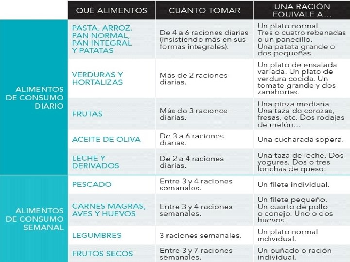 Proteínas Importancia y fuentes • estructura y función de las células • materia prima de nuestros músculos • origen animal (leche, queso, carne, pescado, huevos) • origen vegetal (pan, pasta, cereales, legumbres, etc) ¿Cuánto tomar? • para un adulto se aconseja un consumo diario de 0, 75 g por kg de peso corporal • Ajustar la ración a la edad, el sexo y las circunstancias personales • Incrementar durante la gestación y la lactancia • no más de un 15% del aporte calórico diario