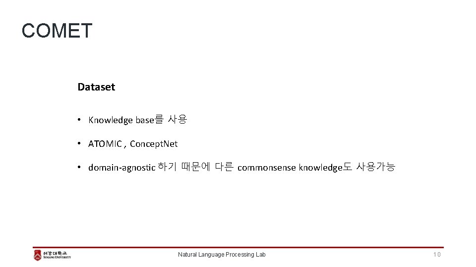 COMET Dataset • Knowledge base를 사용 • ATOMIC , Concept. Net • domain-agnostic 하기 때문에 다른 commonsense knowledge도 사용가능 Natural Language Processing Lab 10