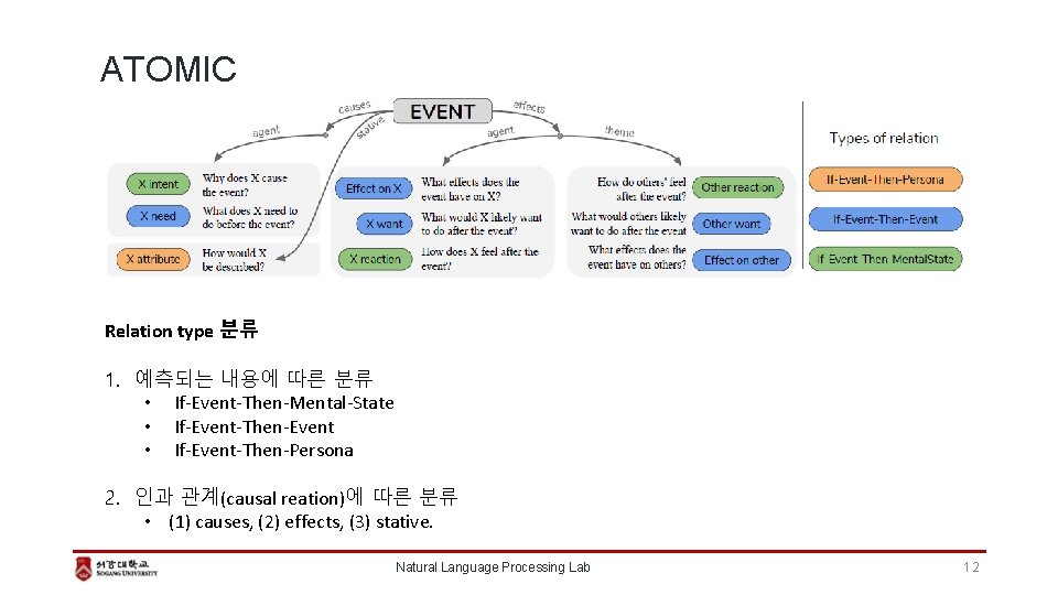 ATOMIC (An Atlas of Machine Commonsense for If. Then Reasoning) 특징 • Taxonomic , encyclopedic knowledge를 가진 기존 knowledge base와는 다르게 추론적인 if-then Knowledge 에 초점을 둠. • scale, coverage, and quality를 중점으로 지식베이스를 구축. • 기존 corpora에서 comonsense를 추출하는게 아닌 crowdsourcing experiment에 초점을 둠. Natural Language Processing Lab 11