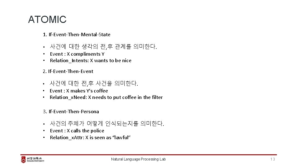 ATOMIC Relation type 분류 1. 예측되는 내용에 따른 분류 • If-Event-Then-Mental-State • If-Event-Then-Event • If-Event-Then-Persona 2. 인과 관계(causal reation)에 따른 분류 • (1) causes, (2) effects, (3) stative. Natural Language Processing Lab 12