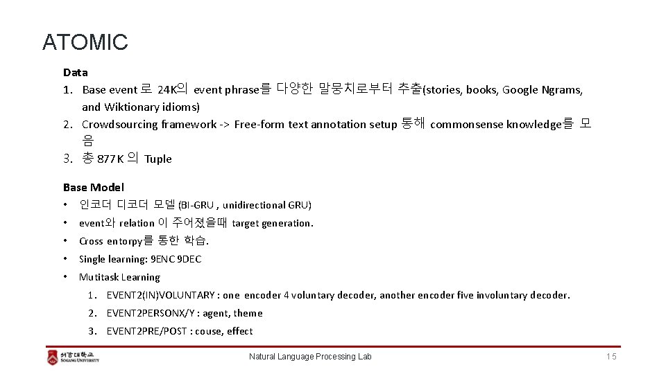ATOMIC Data 1. Base event 로 24 K의 event phrase를 다양한 말뭉치로부터 추출(stories, books, Google Ngrams, and Wiktionary idioms) 2. Crowdsourcing framework -> Free-form text annotation setup 통해 commonsense knowledge를 모 음 3. 총 877 K 의 Tuple Base Model • 인코더 디코더 모델 (BI-GRU , unidirectional GRU) • event와 relation 이 주어졌을때 target generation. • Cross entorpy를 통한 학습. • Single learning: 9 ENC 9 DEC • Mutitask Learning 1. EVENT 2(IN)VOLUNTARY : one encoder 4 voluntary decoder, another encoder five involuntary decoder. 2. EVENT 2 PERSONX/Y : agent, theme 3. EVENT 2 PRE/POST : couse, effect Natural Language Processing Lab 15