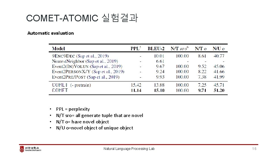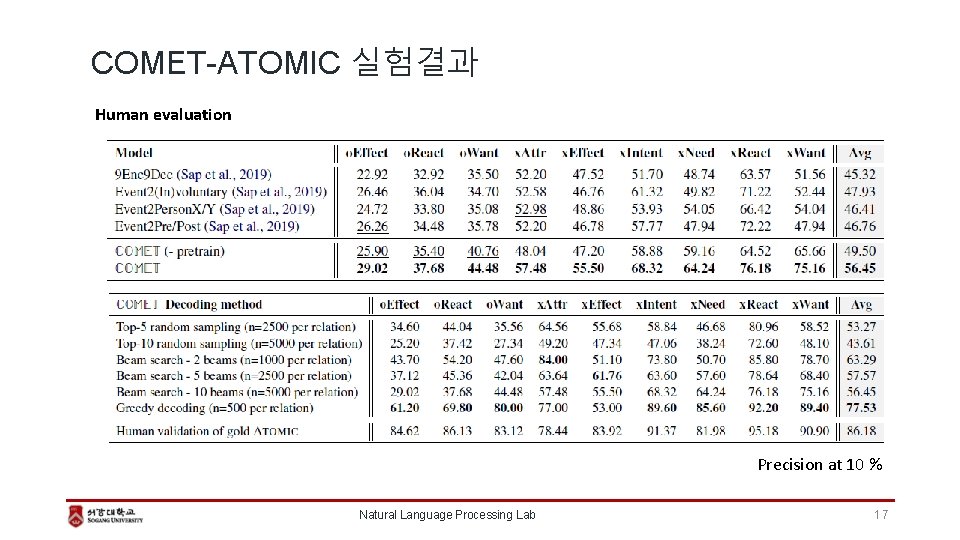 COMET-ATOMIC 실험결과 Automatic evaluation • • PPL = perplexity N/T sro= all generate tuple that are novel N/T o= have novel object N/U o=novel object of unique object Natural Language Processing Lab 16