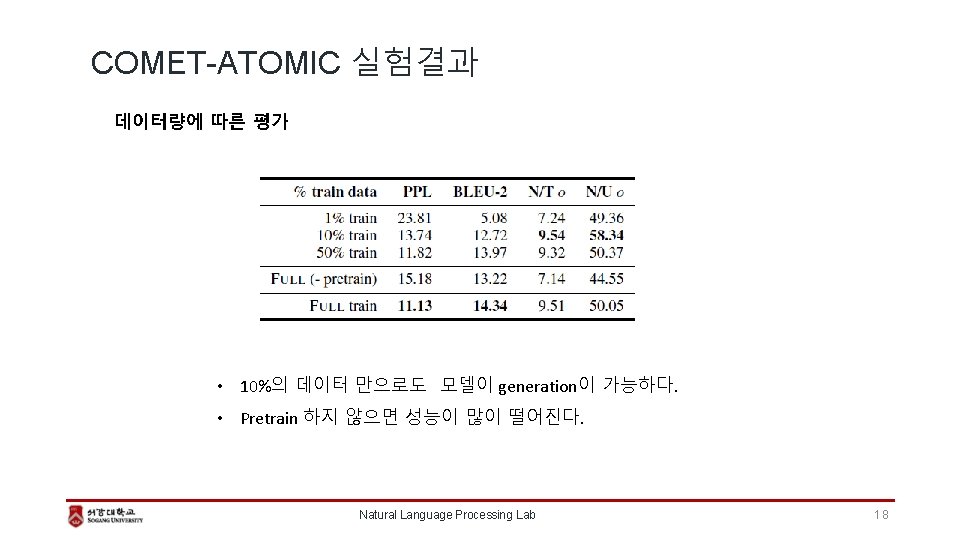 COMET-ATOMIC 실험결과 Human evaluation Precision at 10 % Natural Language Processing Lab 17