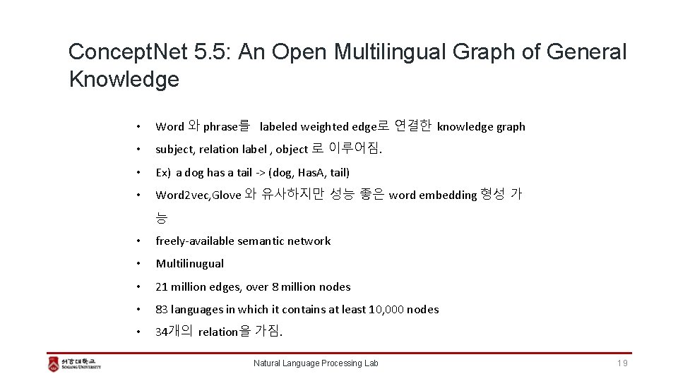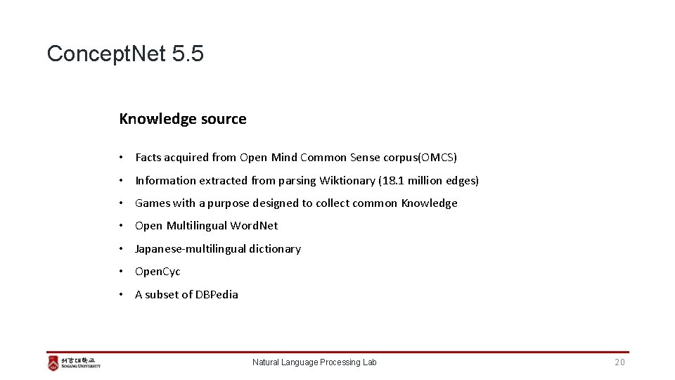 Concept. Net 5. 5: An Open Multilingual Graph of General Knowledge • Word 와 phrase를 labeled weighted edge로 연결한 knowledge graph • subject, relation label , object 로 이루어짐. • Ex) a dog has a tail -> (dog, Has. A, tail) • Word 2 vec, Glove 와 유사하지만 성능 좋은 word embedding 형성 가 능 • freely-available semantic network • Multilinugual • 21 million edges, over 8 million nodes • 83 languages in which it contains at least 10, 000 nodes • 34개의 relation을 가짐. Natural Language Processing Lab 19