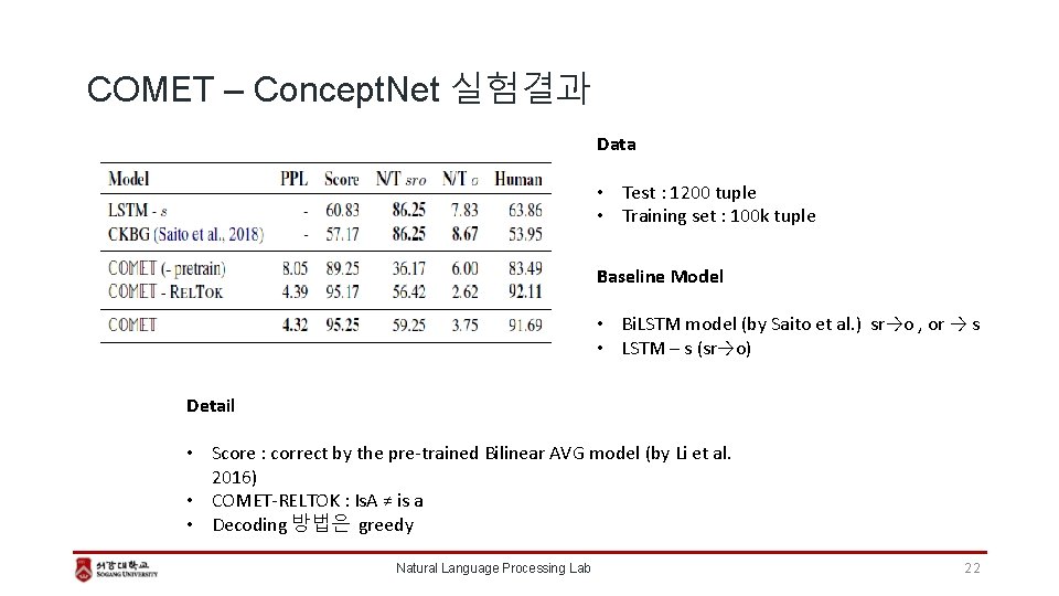 COMET – Concept. Net 실험결과 Data • Test : 1200 tuple • Training set : 100 k tuple Baseline Model • Bi. LSTM model (by Saito et al. ) sr→o , or → s • LSTM – s (sr→o) Detail • Score : correct by the pre-trained Bilinear AVG model (by Li et al. 2016) • COMET-RELTOK : Is. A ≠ is a • Decoding 방법은 greedy Natural Language Processing Lab 22