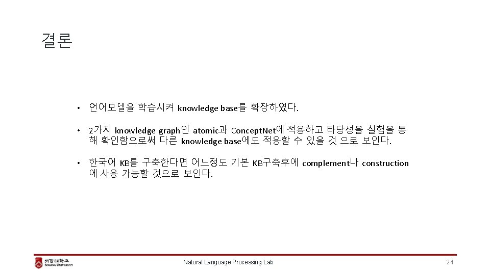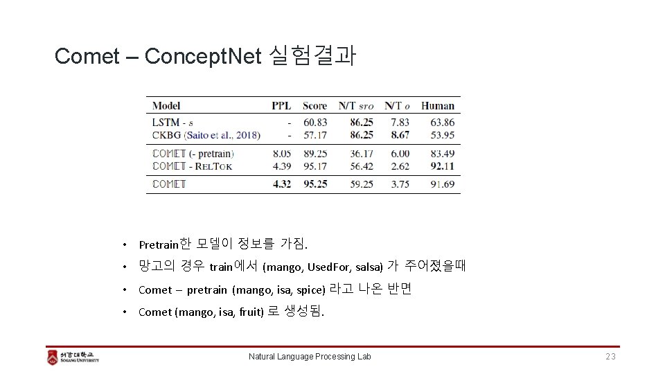 Comet – Concept. Net 실험결과 • Pretrain한 모델이 정보를 가짐. • 망고의 경우 train에서 (mango, Used. For, salsa) 가 주어졌을때 • Comet – pretrain (mango, isa, spice) 라고 나온 반면 • Comet (mango, isa, fruit) 로 생성됨. Natural Language Processing Lab 23
