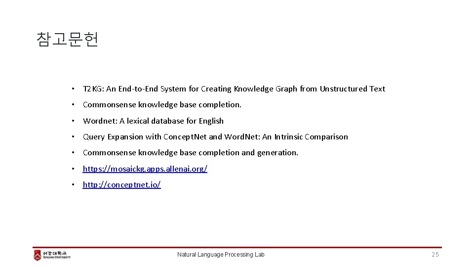 참고문헌 • T 2 KG: An End-to-End System for Creating Knowledge Graph from Unstructured Text • Commonsense knowledge base completion. • Wordnet: A lexical database for English • Query Expansion with Concept. Net and Word. Net: An Intrinsic Comparison • Commonsense knowledge base completion and generation. • https: //mosaickg. apps. allenai. org/ • http: //conceptnet. io/ Natural Language Processing Lab 25