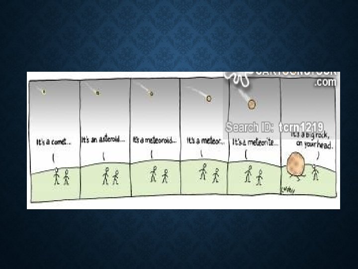 DID YOU KNOW? ? • The mass of the earth increases every year because of the 3, 000 TONS of meteorite debris that hits the surface from space! • Approximately every 50 -60 years, somebody is struck by a meteor; last time was in 1954 • The odds of you being hit is a billion to one (no human has ever been killed by a meteor strike).