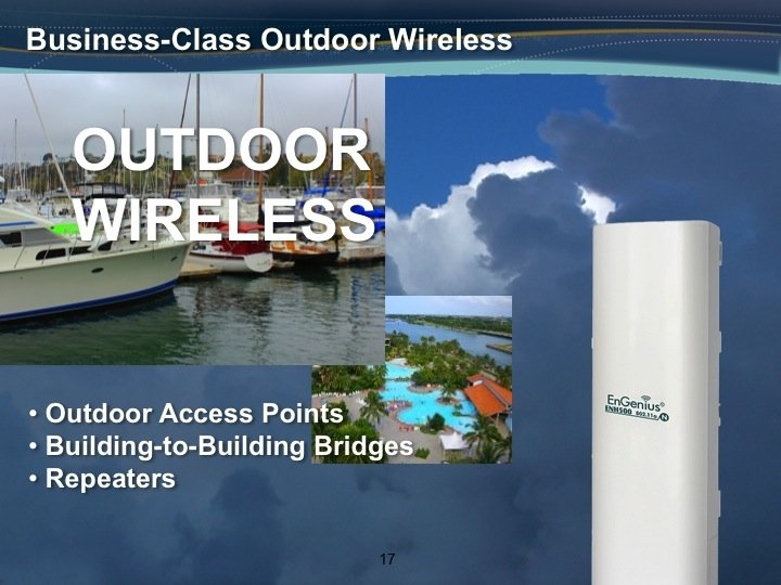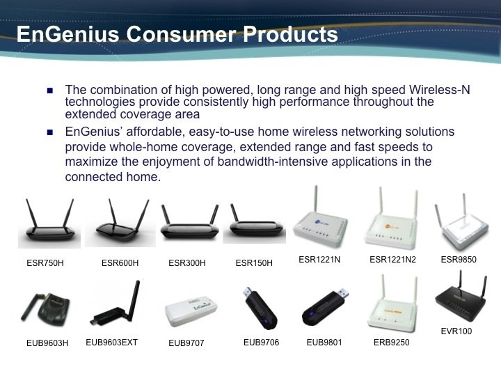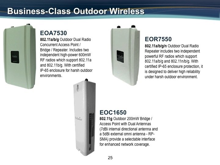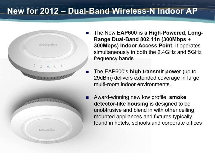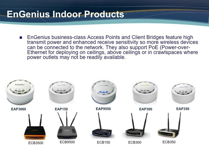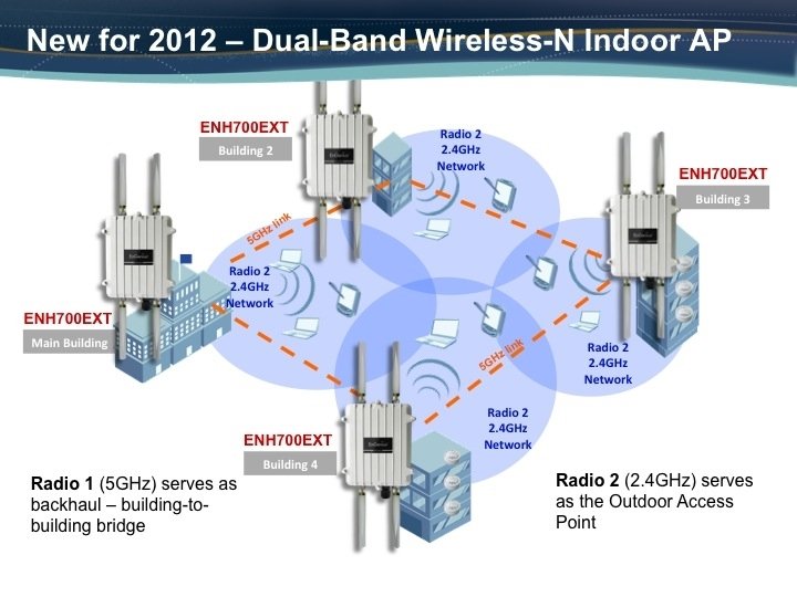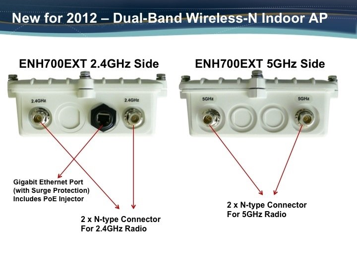 New for 2012 – 800 m. W Wireless-N Outdoor AP & Bridge ENH 210 EXT High-powered, longrange 2. 4 GHz Wireless. N Outdoor Access Point delivering data at up to 300 Mbps. Its high 800 m. W transmit power and high receive sensitivity make it a robust solution for extending company networks. ENH 210 Long-range outdoor 802. 11 n Wireless-to-Ethernet Client Bridge operating in 2. 4 GHz band at data rates up to 300 Mbps. 800 m. W transmit power ideal for building-tobuilding deployments or IP security camera wireless applications in remote parking lots or parking structures.