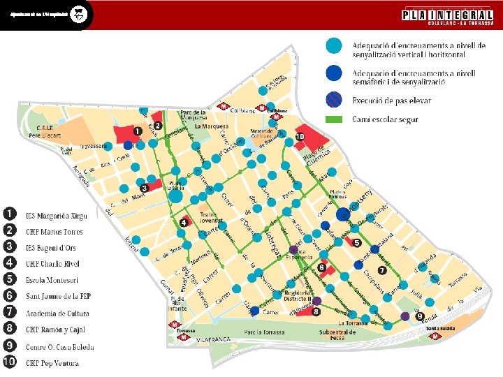 1. 2. Camí Escolar Segur altres actuacions - Adequació carrer Montseny-carrer Progrès - Adequació Rbla. Catalana-Rda. Torrassa - Renovació voreres carrer Jaume Busquets entre Rda. de la Torrassa-Rbla. Catalana - Reposició paviment Pl. Espanyola - Voreres, tanca, arbres i pilones a: Martí Julià entre Rbla. Catalana i Rda. de la Torrassa - Tanca Camí Escolar al carrer LLança Dades d’interès de les anteriors actuacions 1. 660, 50 m 2 de vorera 146 pilones normals 21 arbres replantats 80 m. tanca escola