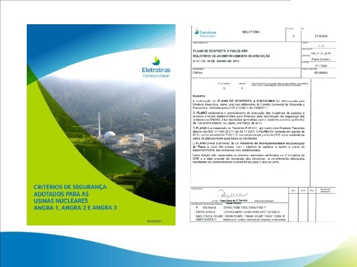 Resposta da Eletronuclear ü a ELETRONUCLEAR reagiu ao acidente de forma rápida e perfeitamente integrada às iniciativas da indústria nuclear no mundo; ü a ELETRONUCLEAR desenvolve um programa abrangente de estudos e projetos para incorporação das lições aprendidas com o acidente de Fukushima, perfeitamente alinhado em escopo e compatível em prazos com as ações da indústria nuclear a nível internacional; ü a ELETRONUCLEAR já concluiu o seu relatório de avaliação de resistência das usinas da CNAAA e definiu as ações de curto prazo a serem implementadas, ações estas já em curso.