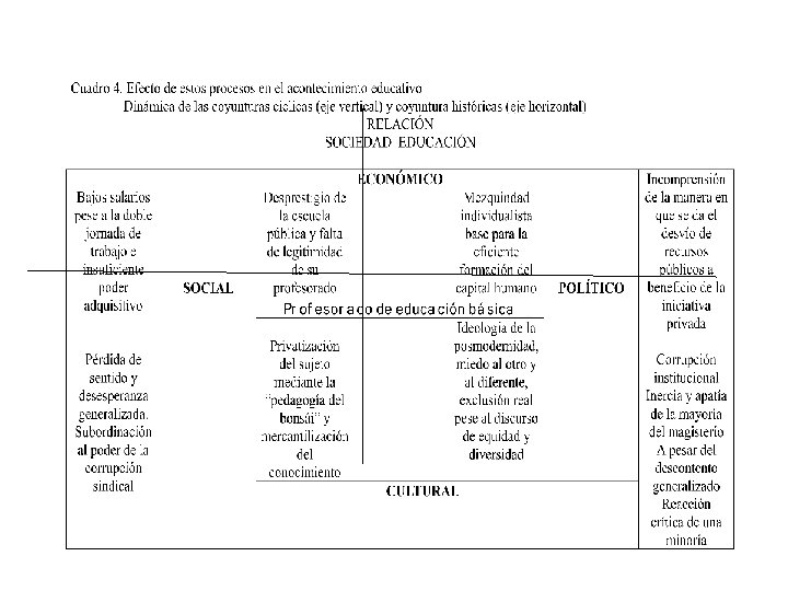 • 6) infraestructura y equipo • La infraestructura y el equipo de las escuelas se caracterizan por lo siguiente: 1. El estado general de las escuelas públicas es de bastante deterioro y abandono por parte del estado, resultado del poco financiamiento para su construcción, mantenimiento y equipamiento. 2. Ni las ni los alumnos de la educación básica reciben alimentos en las escuelas. 3. Los espacios de práctica y expresión deportiva, artística, cultural, etc. no existen 4. Gran cantidad de comunidades, barrios y colonias no cuentan con escuela. • • 7) Cultura laboral y pedagógica La cultura laboral y pedagógica está matizada por la reproducción de conductas y acciones que emanan del capitalismo neoliberal: La sobreexplotación del magisterio, la carga de contenidos educativos, apuntalados con el autoritarismo y verticalismo de las autoridades educativas. No se dan las condiciones para el desarrollo de una convivencia plena, en la que la colaboración, la solidaridad y los objetivos de la colectividad sean los que predominen. La atomización de las voluntades individuales, sujetas al modelo neoliberal, es el ideal que anima a los neoliberales para someter a la sociedad a sus designios. Carrera Magisterial es desde 1992 (ANMEB), el nuevo esquema laboral que potencialmente induce la flexibilización, la polivalencia voluntaria y la individualización de la relación laboral, suprimiendo la contratación colectiva y motivando la competencia indiscriminada por los puntos.