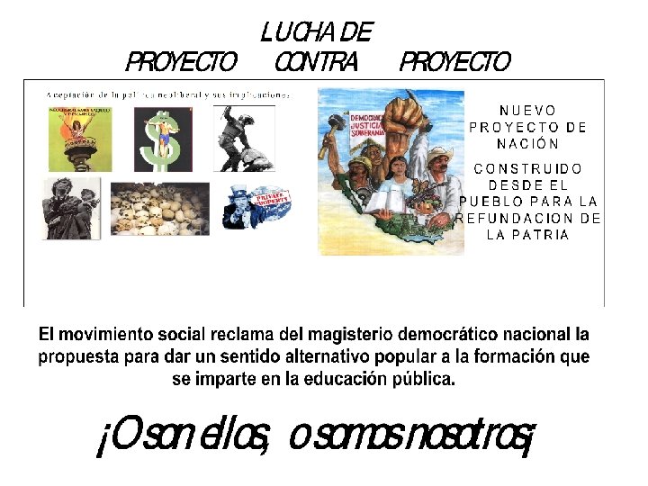 • El sustento educativo Reflejan acríticamente los valores, sentidos y principios que convienen al actual régimen para mantener su grado de dominación sobre la población. El conocimiento en general y la educación en lo particular, no está al servicio de la resolución de los problemas de la inmensa mayoría de la población. La actual teoría educativa sirve para preservar el orden social actual y contribuye a legitimar una elemental instrucción escolar. La educación sustentada en este tipo de teoría educativa no persigue la formación integral de los seres humanos ni la hace comprender el sentido de solidaridad social, de armonía, de respeto por la naturaleza y de la vida misma. • 9) Formación docente, Normalismo Rural y UPN Golpe al perfil docente, a la formación docente, al normalismo y a las condiciones de trabajo. • 10) El golpe al sector universitario, de la investigación y la cultura. • Los procesos formativos en las escuelas oficiales de todos los niveles, incluido el universitario han ajustado sus planes y programas a esquemas de menor profundización en los estudios e investigaciones, al abandono de las lógicas de las disciplinas del conocimiento y a una mayor fragmentación de los campos de estudio, lo que ha devenido en actitudes pragmáticas y mercantilistas en muchos de los nuevos profesionistas.