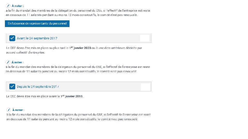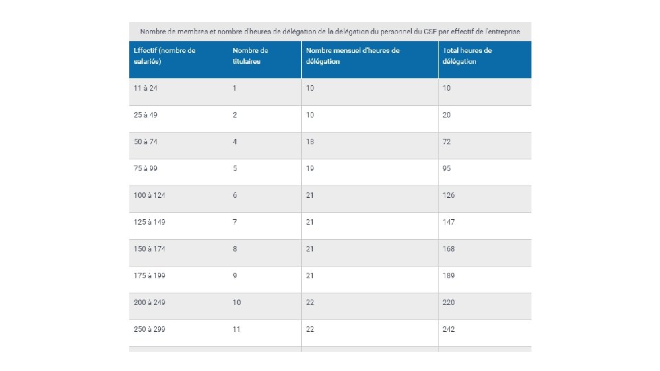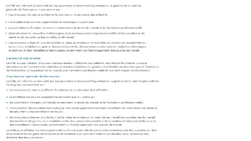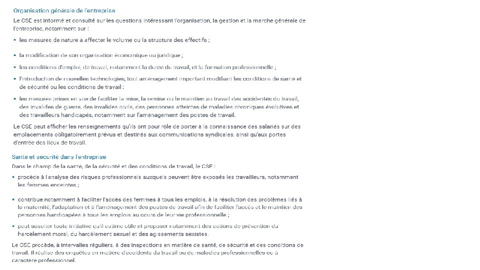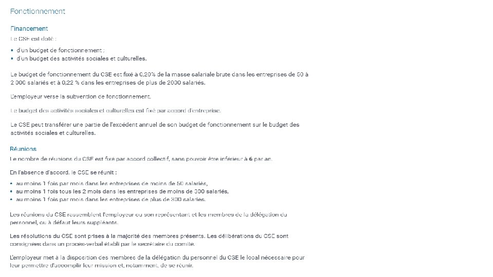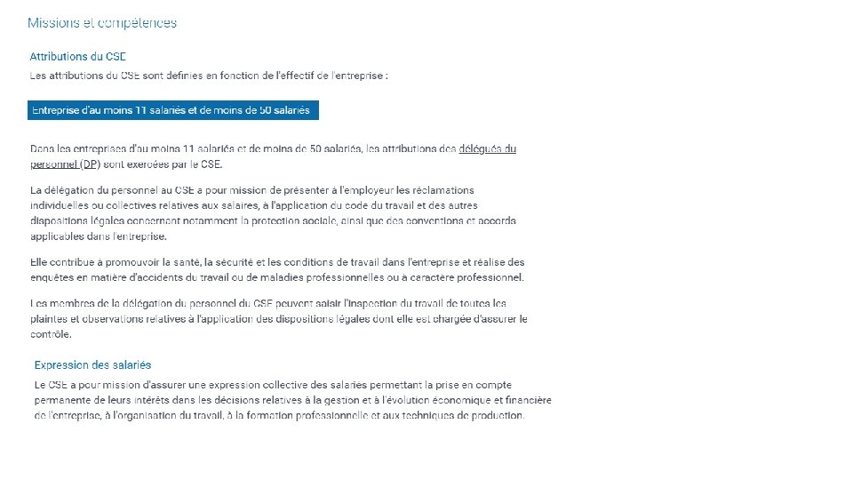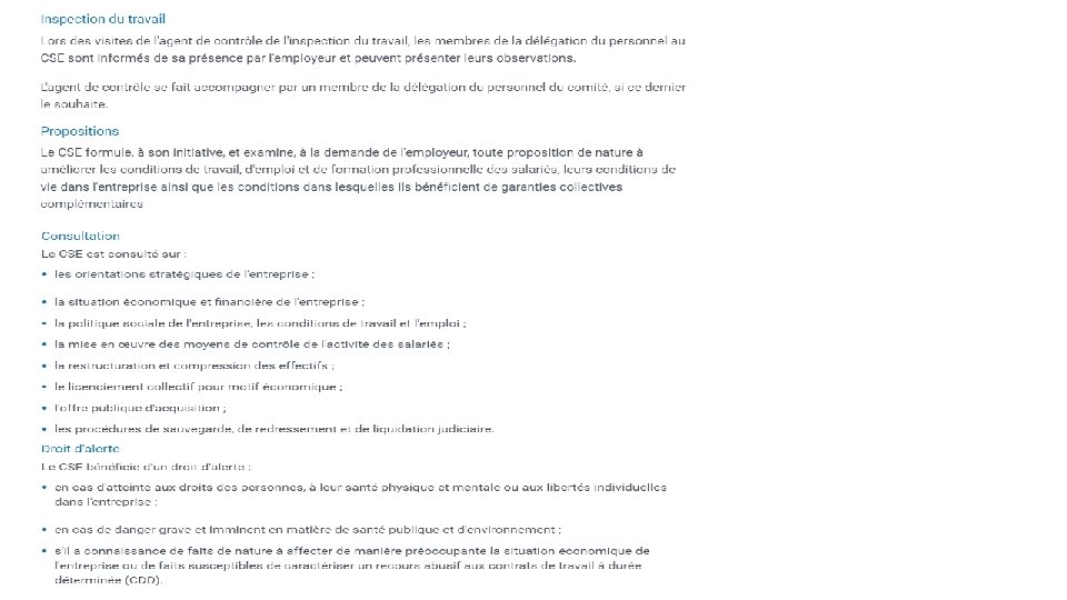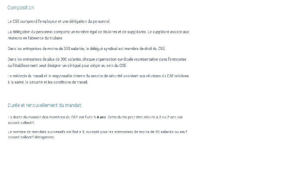 • Code du travail : articles L 2311 -1 à L 2311 -2 • Mise en place du CSE • Code du travail : articles L 2312 -11 à L 2312 -16 • Attributions du CSE • Code du travail : article L 2315 -15 • Affichage • Code du travail : article L 2312 -38 • Méthodes de recrutement et moyens de contrôle de l'activité des salariés • Code du travail : articles L 2312 -26 à L 2312 -35 • Consultation annuelle sur la politique sociale de l'entreprise, les conditions de travail et l'emploi • Code du travail : articles L 2315 -7 à L 2315 -13 • Heures de délégation • Code du travail : articles L 2315 -16 à L 2315 -17 • Formation • Code du travail : articles L 2314 -18 à L 2314 -25 • Électorat et éligibilité • Code du travail : articles L 2314 -33 à L 2314 -37 • Durée et fin du mandat • Code du travail : articles L 2314 -1 à L 2314 -3 • Composition du CSE • Code du travail : articles L 2314 -4 à L 2314 -10 • Organisation des élections • Code du travail : articles L 2315 -21 à L 2315 -22 • Réunions dans les entreprises de moins de 50 salariés • Code du travail : article L 2315 -28 • Réunions dans les entreprises de moins de 300 salariés et d'au moins 300 salariés • Code du travail : articles R 2314 -1 • Nombre de membres et d'heures de délégation de la délégation du personnel du CSE