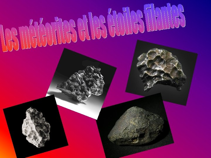 • Comme tous les corps du système solaire, des météorites ont commencé à se former dans l’énorme ensemble d’étoiles et de matière en même temps que le Soleil et les planètes, il y a 4, 56 milliards d'années. Elles se sont réunies, formant des astéroïdes. Des impacts violents ont pu casser l'astéroïde, mettre à nu le noyau, ce qui allait devenir des météorites métalliques. Par ailleurs, certaines météorites ont la même composition que le sol lunaire ou martien.