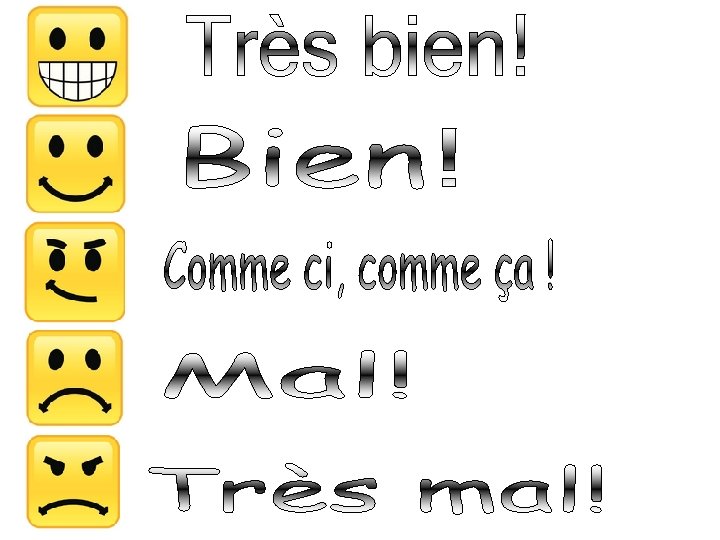 1, 2, 3, 4, 5 Bonjour, salut, ça va bien? 6, 7, 8, 9, 10 Oui, ça va très bien, merci. 11, 12, 13, 14, 15 Ça ne va pas, ça va mal 16, 17, 18, 19, 20 Comme ci, comme ça, au revoir!