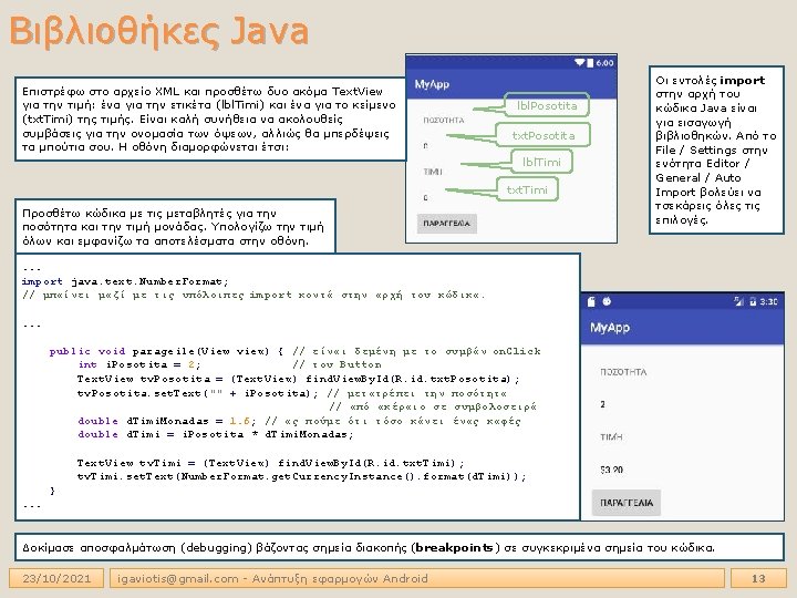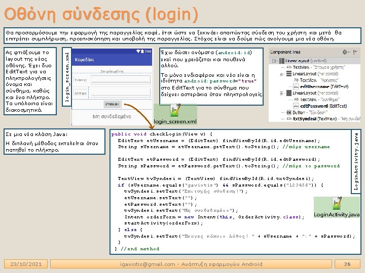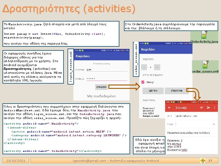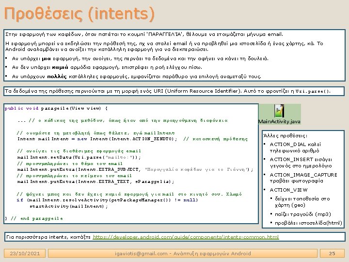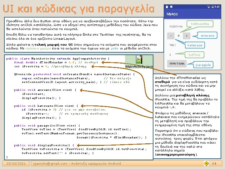 Παραγγελία καφέδων Θα εξελίξουμε την εφαρμογή με περισσότερες επιλογές, πχ καφές με σαντιγί. public class Main. Activity extends App. Compat. Activity { final double timi. Kafe = 1. 6; // σταθερές final double timi. Santigy = 0. 5; int posotita = 0; //μεταβλητή κλάσης Θα υπολογίζει πόσο κάνουν οι καφέδες και θα τυπώνει ανάλογο μήνυμα. @Override protected void on. Create(Bundle saved. Instance. State) {. . . } public void anevase(View view) {. . . } public void katevase(View view) {. . . } txt. Posotita public void parageile(View view) { double axia; Check. Box cb. Extra = (Check. Box) find. View. By. Id(R. id. chk. Extra); String s. Extras; if (cb. Extra. is. Checked()) { s. Extras = "Με σαντιγύ"; axia = posotita * (timi. Kafe + timi. Santigy); } else { s. Extras = "Χωρίς σαντιγύ"; axia = posotita * timi. Kafe; } String s. Paraggelia = "Ποσότητα: " + posotita + "n" + s. Extras + "nΑξία: " + Number. Format. get. Currency. Instance(). format(axia) + "nΕυχαριστώ πολύ!"; chk. Extra paraggeile txt. Paraggelia Για να μετακινείται κατακόρυφα η οθόνη σε περίπτωση που δεν χωράνε όλες οι όψεις στην οθόνη (ή γυρίσουμε σε οριζόντια διάταξη), τυλίγουμε όλες τις όψεις της διεπαφής στον υποδοχέα Scroll. View. 23/10/2021 Όπου. . . δες τον κώδικα στη διαφάνεια 'UI και κώδικας για παραγγελία' Text. View tv. Paraggelia = (Text. View) find. View. By. Id(R. id. txt. Paraggelia); tv. Paraggelia. set. Text(s. Paraggelia); } public void display. Posotita() {. . . } } igaviotis@gmail. com - Ανάπτυξη εφαρμογών Android 24