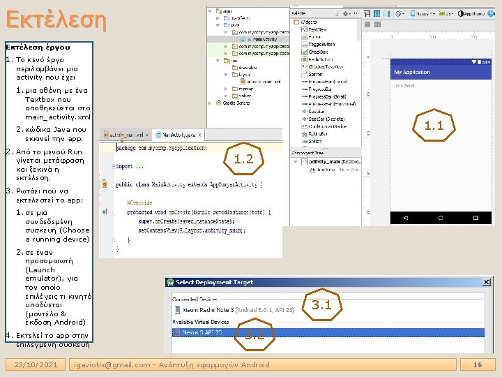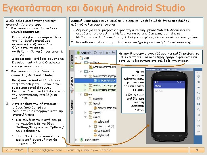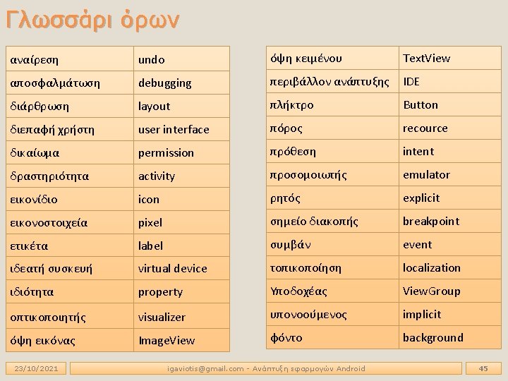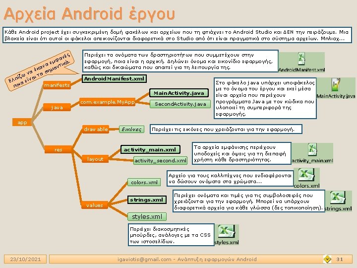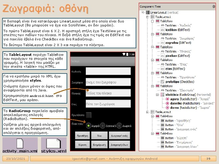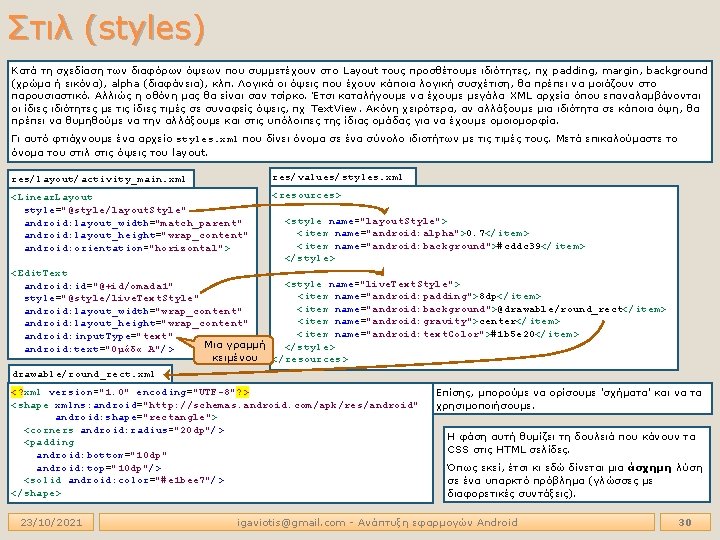 Υποδοχέας Relative. Layout <Relative. Layout xmlns: android="http: //schemas. android. com/apk/res/android" android: layout_width="match_parent" android: layout_height="match_parent"> <Text. View android: id="@+id/lyla_text_view" // ορίζει το όνομα android: layout_align. Parent. Bottom="true" android: layout_align. Parent. Left="true" android: text. Size="24 sp" android: text="Lyla" /> <Text. View android: id="@+id/me_text_view" android: layout_align. Parent. Bottom="true" android: layout_to. Right. Of="@id/lyla_text_view"//αναφορά στην όψη android: text. Size="24 sp" android: text="Me" /> <Text. View android: id="@+id/ben_text_view" android: layout_align. Parent. Top="true" android: layout_center. Horizontal="true" android: text. Size="24 sp" android: text="Ben" /> <Text. View android: id="@+id/kunal_text_view" android: layout_align. Parent. Top="true" android: layout_to. Left. Of="@id/ben_text_view" android: text. Size="24 sp" android: text="Kunal" /> </Relative. Layout> 23/10/2021 igaviotis@gmail. com - Ανάπτυξη εφαρμογών Android Για να προσδιορίσεις μια όψη της δίνεις μοναδικό όνομα με το android: id="@+id/view_name" Το @+id προσθέτει νέο όνομα στην περιοχή ονομάτων που πλέον μπορεί να χρησιμοποιείται ως προσδιοριστικό του αντικειμένου. Το όνομα πρέπει να είναι μοναδικό. Για να αναφερθείς στο αντικείμενο, η σύνταξη είναι "@id/view_name" χωρίς το +. Ποιος το σκέφτηκε αυτό! Στον υποδοχέα Relative. Layout η τοποθέτηση (Top, Bottom, Left, Right) γίνεται με σχέση με το γονιό. Ακόμα, μπορούμε να τοποθετήσουμε σε σχέση με τα αδέρφια (to. Right. Of, to. Left. Of, above, below), χρησιμοποιώντας τα ονόματά τους. Μια όψη περικλείει ερμητικά τα περιεχόμενά της αν θέσουμε width και height στην τιμή wrap_content. Για να δώσουμε χώρο γύρω από τα περιεχόμενα, μπορούμε να ορίσουμε την ιδιότητα padding. Εξ ορισμού, δυο όψεις ακουμπούν όταν τοποθετούνται πλάι-πλάι. Για να μην εφάπτονται, μπορούμε να ορίσουμε layout_margin έξω από όλες τις πλευρές (Left, Right, Top, Bottom). 8