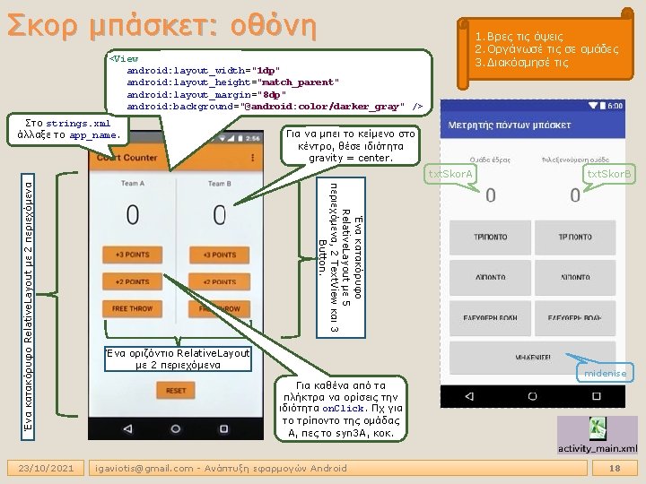 Σκορ μπάσκετ: πρόγραμμα package com. mycomp. mybasket; import android. os. Bundle; android. support. v 7. app. App. Compat. Activity; android. view. View; android. widget. Text. View; public class Main. Activity extends App. Compat. Activity { int i. Skor. A = 0; //τοπικές μεταβλητές για τα σκορ int i. Skor. B = 0; public void syn 3 B(View v){ i. Skor. B += 3; //τρίποντο display. B(); } public void syn 2 B(View v){ i. Skor. B += 2; //δίποντο display. B(); } 2 public void syn 1 B(View v){ i. Skor. B ++; //ελεύθ. βολές display. B(); } @Override protected void on. Create(Bundle saved. Instance. State) { super. on. Create(saved. Instance. State); set. Content. View(R. layout. activity_main); } public void midenise(View v){ //για το κουμπί Μηδένισε! i. Skor. A = 0; public void syn 3 A(View v){ display. A(); i. Skor. A += 3; //τρίποντο i. Skor. B = 0; display. A(); display. B(); } } public void syn 2 A(View v){ private void display. A(){ i. Skor. A += 2; //δίποντο Text. View tv. Skor. A = (Text. View) find. View. By. Id(R. id. txt. Skor. A); display. A(); tv. Skor. A. set. Text("" + i. Skor. A); } } public void syn 1 A(View v){ private void display. B(){ i. Skor. A ++; //ελεύθ. βολές Text. View tv. Skor. B = (Text. View) find. View. By. Id(R. id. txt. Skor. B); display. A(); tv. Skor. B. set. Text("" + i. Skor. B); } } 1 3 } //end class 23/10/2021 igaviotis@gmail. com - Ανάπτυξη εφαρμογών Android 19