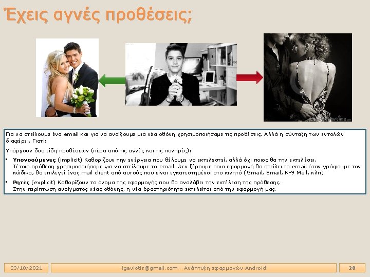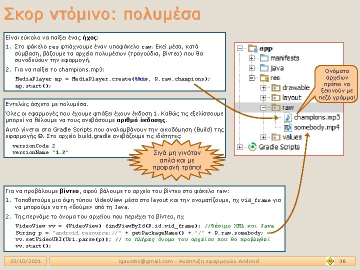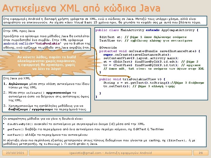 Αποσπάσματα κώδικα (Snippets) Check. Box cb = (Check. Box) find. View. By. Id(R. id. is. Ok); String s; if (cb. is. Checked()) { s = "Εντάξει"; } else { s = "Πρόβλημα"; } //Τοποθέτηση κειμένου σε Text. View tv. Etos = (Text. View) find. View. By. Id(R. id. txt. Etos); tv. Etos. set. Text("2017"); //Ανάγνωση κειμένου από Edit. Text et. Xora = (Edit. Text) find. View. By. Id(R. id. edt. Hora); String s = et. Hora. get. Text(). to. String(); //Αποστολή email Intent i = new Intent(Intent. ACTION_SENDTO); i. set. Data(Uri. parse("mailto: ")); i. put. Extra(Intent. EXTRA_SUBJECT, "Γεια"); if (i. resolve. Activity(get. Package. Manager()) != null) start. Activity(i); //Άνοιγμα οθόνης με όνομα activity Othoni 2. java Intent i = new Intent(this, Othoni 2. class); start. Activity(i); Το σ ν ο κ 23/10/2021 ι κ ά … //Στιγμιαία ειδοποίηση import android. widget. Toast; Toast. make. Text(get. Application. Context(), "Γεια χαρά. . . ", Toast. LENGTH_SHORT). show(); //Παίζει τραγουδάκι από το αρχείο /res/raw/a. Song. mp 3 import android. media. Media. Player; Media. Player mp = Media. Player. create(this, R. raw. a. Song); mp. start(); Video. View vv = (Video. View) find. View. By. Id(R. id. vid_frame); //δέσιμο XML και Java String p = "android. resource: //" + get. Package. Name() + "/" + R. raw. some. Video; vv. set. Video. URI(Uri. parse(p)); //το πλήρες όνομα του αρχείου που θα προβληθεί vv. start(); //ξεκινά να παίζει το βίντεο igaviotis@gmail. com - Ανάπτυξη εφαρμογών Android 37