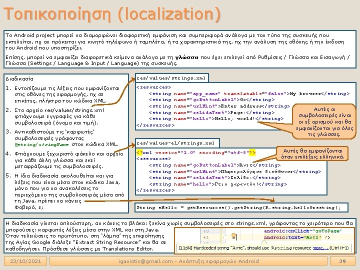 Δικαιώματα και εικονίδιο Στο αρχείο manifests/Android. Manifest. xml δηλώνουμε τα δικαιώματα που πρέπει να έχει η εφαρμογή για να λειτουργεί σωστά. Για να προσπελάσει το Internet, η εφαρμογή χρειάζεται το δικαίωμα: <uses-permission android: name="android. permission. INTERNET" /> (Διακοσμητικό) Για να μη βάζει ως εικονίδιο της εφαρμογής το άσχημο ανθρωποειδές (Android): • Αποθηκεύουμε στο φάκελο res/drawable ένα png αρχείο. • Στο Android. Manifest. xml στην ενότητα application προσθέτουμε την ιδιότητα android: icon να δείχνει προς το όνομα του αρχείου με το νέο εικονίδιο <? xml version="1. 0" encoding="utf-8"? > <manifest xmlns: android="http: //schemas. android. com/apk/res/android" package="com. mycomp. mybrowser"> <uses-permission android: name="android. permission. INTERNET" /> <application android: allow. Backup="true" android: icon="@drawable/doggy" android: label="@string/app_name" android: round. Icon="@mipmap/ic_launcher_round" android: supports. Rtl="true" android: theme="@style/App. Theme"> <activity android: name=". Main. Activity"> <intent-filter> <action android: name="android. intent. action. MAIN" /> <category android: name="android. intent. category. LAUNCHER" /> </intent-filter> </activity> </application> </manifest> 23/10/2021 igaviotis@gmail. com - Ανάπτυξη εφαρμογών Android 23
