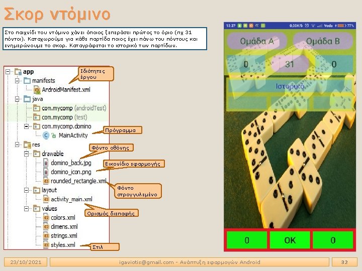 Σκορ ντόμινο: πόροι <? xml version="1. 0" encoding="utf-8"? > <manifest xmlns: android="http: //schemas. android. com/apk/res/android" package="com. mycomp. domino"> Ορίζει νέο σχήμα που χρησιμοποιείται ως φόντο από κάποιες όψεις. <application android: allow. Backup="true" Παραπέμπει σε αρχείο android: icon="@drawable/domino_icon" με το εικονίδιο. android: label="@string/app_name" android: supports. Rtl="true" android: theme="@style/App. Theme. No. Action. Bar"> <activity Ορίζει το όνομα android: name=". Main. Activity" της εφαρμογής. android: label="@string/app_name" android: theme="@style/App. Theme. No. Action. Bar"> <intent-filter> <action android: name="android. intent. action. MAIN"/> <category android: name="android. intent. category. LAUNCHER"/> </intent-filter> </activity> </application> </manifest> Είναι στο res/drawable. <shape xmlns: android=". . . " android: shape="rectangle"> <corners android: radius="20 dp"/> <padding android: bottom="10 dp" android: left="10 dp" android: right="10 dp" android: top="10 dp"/> <solid android: color="#e 1 bee 7"/> </shape> 23/10/2021 Ορίζει στιλ που μπορούν να χρησιμοποιούν οι όψεις της διεπαφής. Κάτι σαν τα CSS για την HTML. Είναι στο res/values. <resources> Διαφάνεια <style name="layout. Style"> <item name="android: alpha">0. 7</item> <item name="android: background">#cddc 39</item> </style> </resources> igaviotis@gmail. com - Ανάπτυξη εφαρμογών Android 33