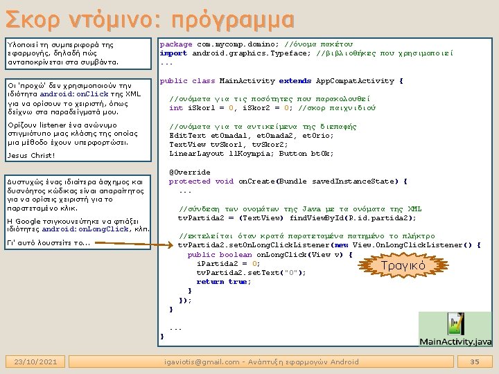 Σκορ ντόμινο: διεπαφή Layout της activity Αποτελείται από υποδοχείς Linear. Layout που οργανώνουν σε ομάδες Edit. Text, Text. View, Button. <Linear. Layout. . . android: background="@drawable/domino_back" android: orientation="vertical"> Εικόνα παρασκηνίου Παραπέμπει σε στιλ για ομοιομορφία. <Edit. Text android: id="@+id/omada 1" style="@style/live. Text. Style" android: input. Type="text" Μία γραμμή κειμένου android: text="Ομάδα Α"/> <Text. View android: id="@+id/partida 1" Για ισοκατανομή style="@style/text. Style" android: layout_width="0 dp" android: layout_height="wrap_content" android: layout_weight="1" Για ισοκατανομή android: background="#11 EE 11" android: on. Click="anevase 1" Μέθοδος που android: text="0"/> εκτελείται στο κλικ 23/10/2021 <Edit. Text Δεκαδικός αριθμός android: id="@+id/orio" style="@style/live. Text. Style" android: input. Type="number. Decimal" android: text="31"/> igaviotis@gmail. com - Ανάπτυξη εφαρμογών Android 34