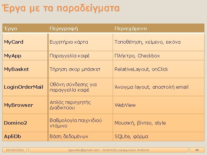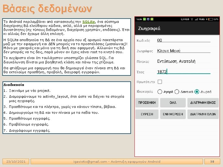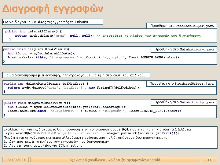 Προβολή εγγραφών Για να προβάλουμε όλες τις εγγραφές του πίνακα, χρησιμοποιούμε έναν δρομέα από την κλάση Cursor. Με την SQL μπορούμε να ταξινομήσουμε, ή φιλτράρουμε τις εγγραφές. public Cursor get. All. Data() { return mydb. raw. Query("SELECT * FROM erga", null); } Προσθήκη στο Database. Helper. java Η μέθοδος εκτελείται όταν πατηθεί το πλήκτρο "Όλα". Παίρνει το δρομέα και τον ξεψαχνίζει. Συσσωρεύει σε μια String. Buffer όλες τις πληροφορίες και τις προβάλει με μια βοηθητική μέθοδο show. Message(). public void ola(View v) { Προσθήκη στο Main. Activity. java Cursor cursor = my. Db. get. All. Data(); if (cursor. get. Count() == 0) show. Message("Δεδομένα στον πίνακα", "Δεν βρέθηκε τίποτα. "); else { String. Buffer buffer = new String. Buffer(); while (cursor. move. To. Next()) { buffer. append("Κωδικός: " + cursor. get. String(0) + "n"); buffer. append("Ζωγράφος: " + cursor. get. String(1) + "n"); buffer. append("Πίνακας: " + cursor. get. String(2) + "n"); buffer. append("Έτος: " + cursor. get. String(3) + "n"); buffer. append("Πρωτότυπο: " + ((cursor. get. String(4). equals("0")) ? "Όχι" : "Ναι") + "n"); String s. Idioktisia = ""; public void show. Message(String title, switch (cursor. get. String(5)) { String message) { case "0": s. Idioktisia = "Αγορά"; break; Alert. Dialog. Builder builder = new case "1": s. Idioktisia = "Δανεικό"; break; Alert. Dialog. Builder(this); case "2": s. Idioktisia = "Δωρεά"; break; builder. set. Cancelable(true); } builder. set. Title(title); buffer. append("Ιδιοκτησία: " + s. Idioktisia + "nn"); builder. set. Message(message); } //end while builder. show(); show. Message("Δεδομένα στον πίνακα", buffer. to. String()); } } //end else } 23/10/2021 igaviotis@gmail. com - Ανάπτυξη εφαρμογών Android 43