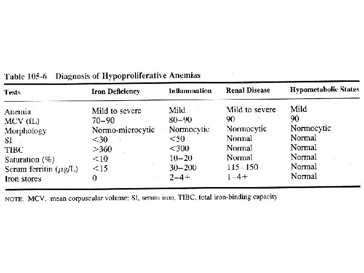 Laboratory tests to distinguish iron deficiency anemia from anemia of chronic disease (ACD) Measurement Normal Iron Units Values Deficiency ACD Low normal - ACD + Iron deficiency g/d. L 50 – 150 Serum total iron-binding g/d. L 250 – 400 capacity Transferrin saturation 20 – 50 g/L 20 – 350 Normal - Serum iron Serum ferritin Serum soluble transferrin receptor % Low normal - Normal - n. M 9 – 28 Normal Bone marrow iron stores 0 -4+ 2 – 3+ Normal 20 – 80% Iron-containing normoblasts in the bone marrow %