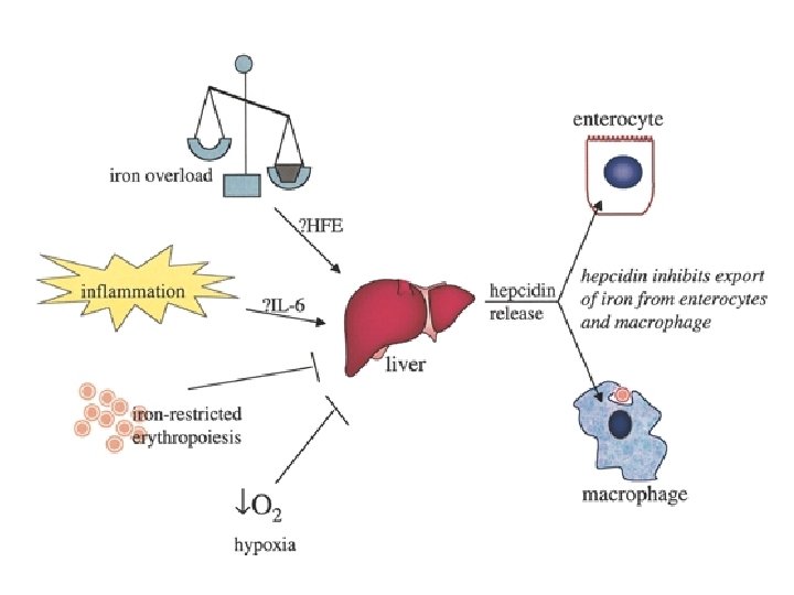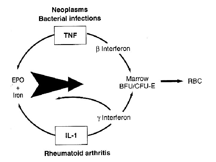 Causes of Anemia of Chronic Disease Block in reuse of iron by erythrocyte Shortened erythrocyte survival Direct inhibition of erythropoiesis Relative deficiency of erythropoietin