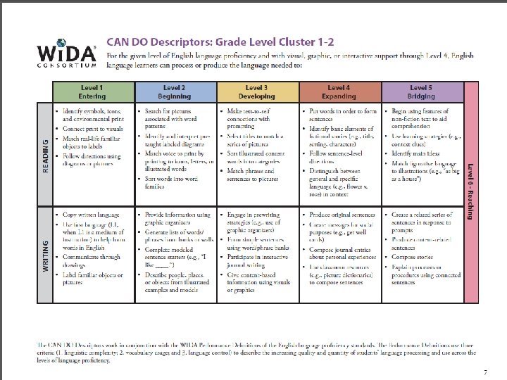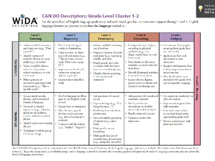 WIDA MPI � We have curriculum and standards for ELLs, too! � WIDA � Model Performance Indicators (MPIs) � Indicates grade levels, standards/core content, language proficiency level, language function, type of support