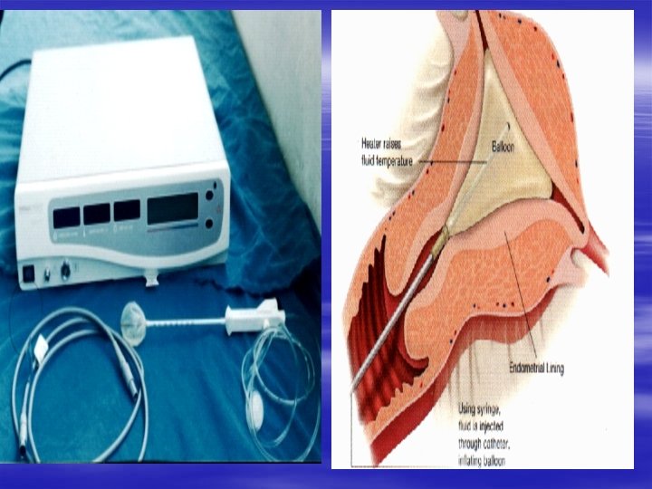 Thermachoice ballon This uses a balloon placed in the uterine cavity through the cervix. Hot water is circulated inside the balloon to destroy the endometrium. Thermachoice Balloon Ablation Central element heats liquid circulated in balloon 87 degrees C for 8 minutes. Limitations: * uterine cavity size 6 -10 cm; * can’t treat submucous myomas.