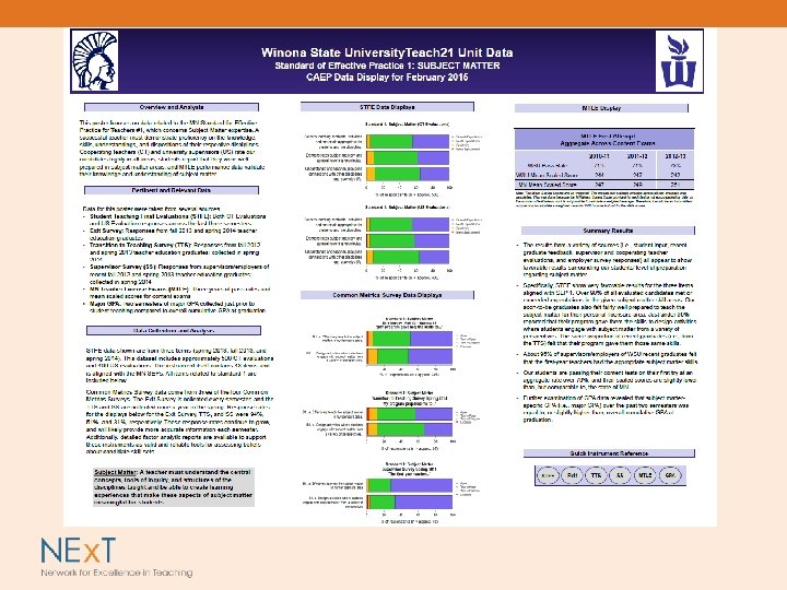 Concordia Univ. St. Paul and CAEP-CIP • Background: Education Department is few in numbers and large in aspirations and plans for the future based on data from multiple measures. • Continuous improvement with reliance on Ne. XT surveys for baseline data combined with other measures • Using the data for program improvement – Earlier interviews for program – Procedures for working with ELLs who are pursuing teaching credentials – Data days for faculty and with stakeholders – Curriculum map – Use of integrated platform (Live Text) for all teacher education procedures