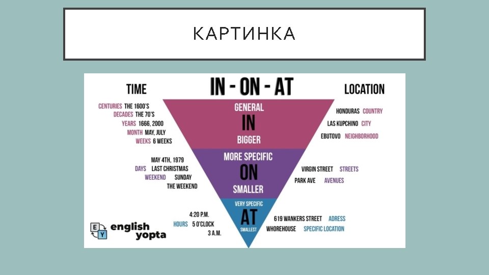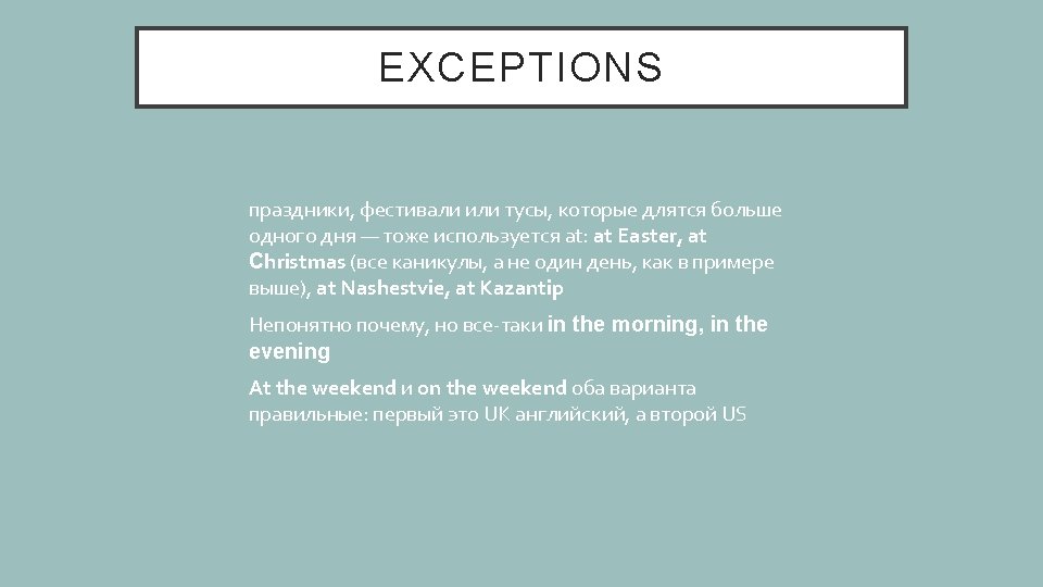 PLEASE, STOP You should not use prepositions IN, ON, AT with LAST, NEXT, EVERY and THIS • I was depressed last May (in last May) • I’m planning to rob a bank next Monday (on next Monday) • I eat donuts every Christmas (at every Christmas) • I will take a walk naked this evening (in this evening)