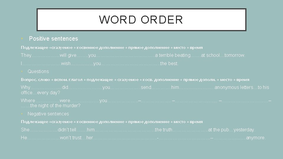 MY CURRENT LIST OF COMMON MISTAKES • Russian word order • Misuse of tenses • Improper plurals • Misuse of prepositions or their omission • Noun+verb agreement • Verb tenses shifts • Improper use of resembling words (affect / effect, its / it’s, advice / advise, etc. ) • Grammar inaccuracy (which / that, numerals, abbreviations, etc. ) • Punctuation mistakes