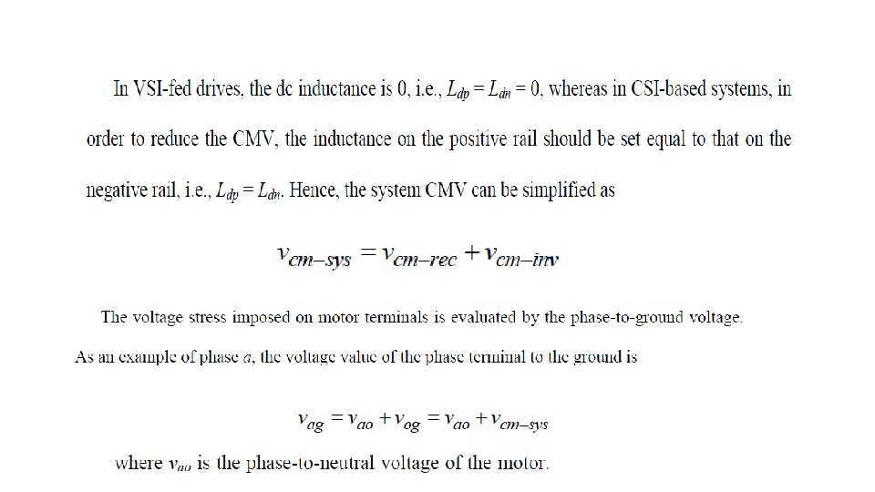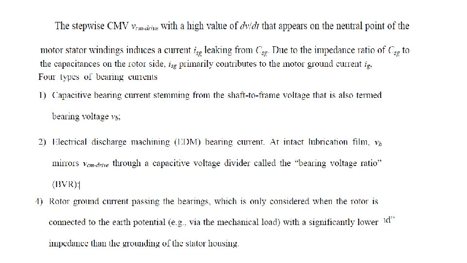 The MV drives (2. 3 k. V– 13. 8 k. V) do not allow their motors to be subjected to any CMVs; otherwise replacement of damaged motors would be very costly in addition to causing loss of production. The CMV stress, on the other hand, is often neglected in lowvoltage (LV: ≤ 600 V) drives. The conservative insulation design of LV motors supports it. However, the other CMV issues induced via the parasitically capacitive couplings inside the motor, including the shaft voltage, ground and bearing currents, exist in both MV and LV drives, and can not be ignored.