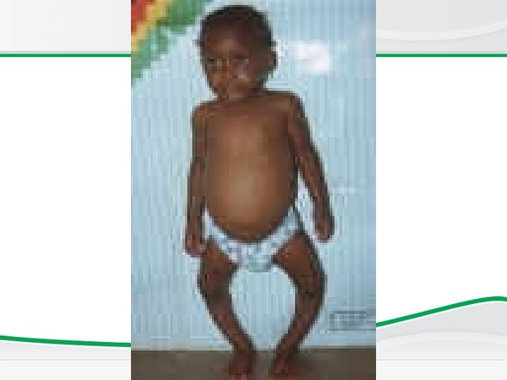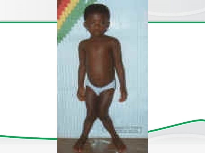 Skeletal manifestations EXTREMITIES – Enlargement of long bones around wrists and ankles Bow legs, knock knees green stick fractures