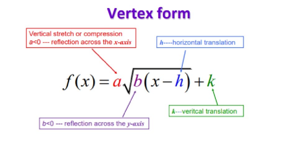 • The vertex is at ( h, k) • The axis of symmetry is x=h • The graph has a vertical shift of k