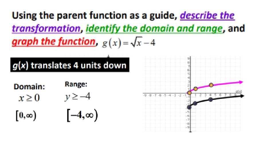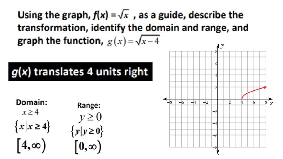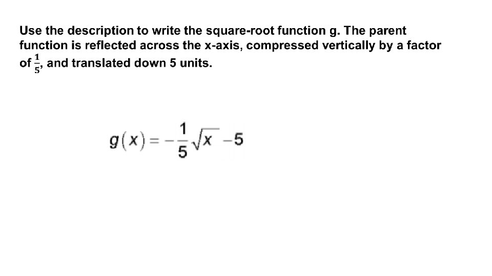 YOUR TURN List the transformation on the parent function & state the domain & range and then graph. Vertical reflection over the x-axis 2 units horizontally left 5 units vertically down