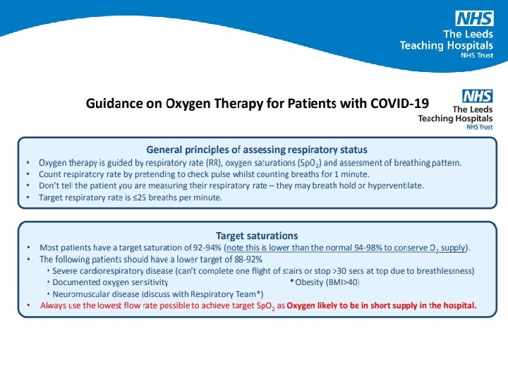 Oxygen prescription • Prescription only drug (except in emergency situations) • Should record the indication, mode of delivery and monitoring parameters • Target saturations should be documented and titrate as required – 94 - 98% – 88 - 92% - those at risk of type 2 Respiratory failure