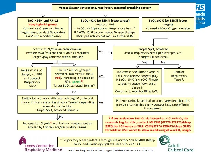 POINTS TO REMEMBER • • • Whichever system your area uses to deliver humidified oxygen, remember that you need to look at the dial to understand the litres per minute that you need to run the system at, to deliver a set percentage of Oxygen If changing the % and/or the litres, please check that the 2 correlate, LOOK at the Valve! Oxygen treats hypoxaemia not breathlessness Target is normal oxygen saturations (94 -98%) for all, except those with Type II respiratory failure (88 -92%) Oxygen must be prescribed with target saturation Appropriate oxygen device must be used Patients receiving oxygen need close monitoring, allow at least 5 minutes between increasing their inspired oxygen delivered (unless emergency situation) Oxygen saturations must be measured with the appropriate probe and be wary in very unwell patients Different manufacturers will have slightly different variations Always, always record the % of inspired O 2 on e. Obs if on humidified oxygen – please ask someone if you are unsure