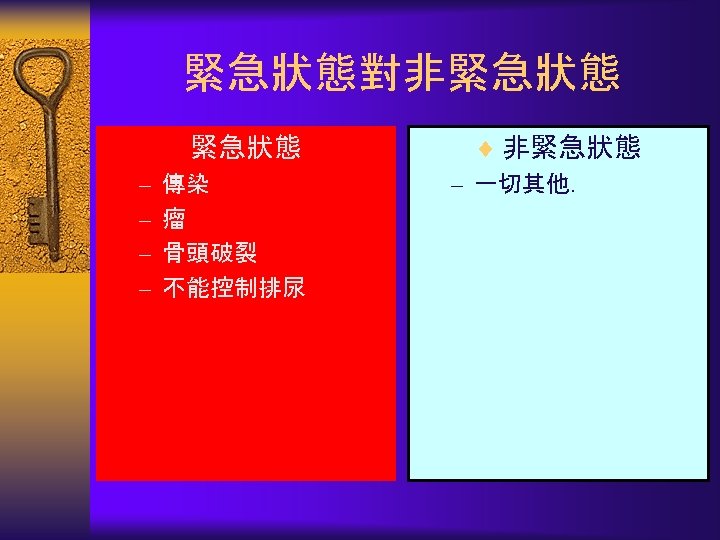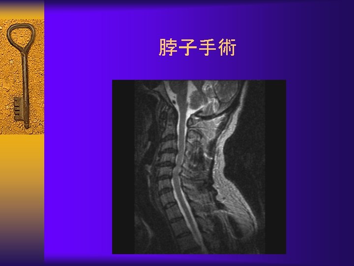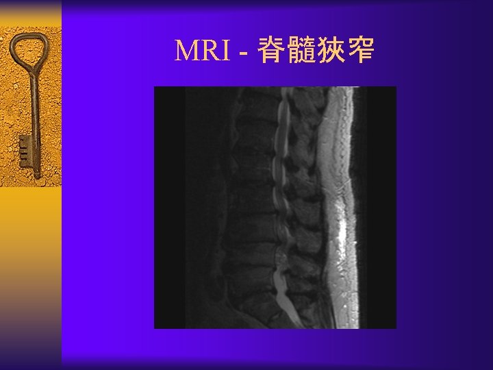 Outline ¨ Urgent Vs. Elective. (緊急狀態對非緊急狀 態) ¨ Diagnosis of four common spine disorders – Spinal Stenosis 脊髓狹窄 – Disk degeneration 脊椎圓盤退化 – Herniated Disc 圓盤推出擠壓 – Arthritis (spondylosis) 關節炎 ¨ Treatment of common spine disorders – Nonsurgical Vs. Surgical 沒有手術對手術