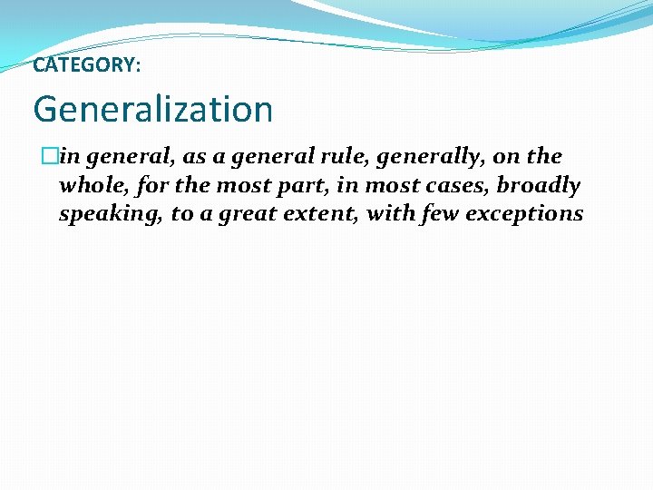 CATEGORY: Generalization �in general, as a general rule, generally, on the whole, for the most part, in most cases, broadly speaking, to a great extent, with few exceptions