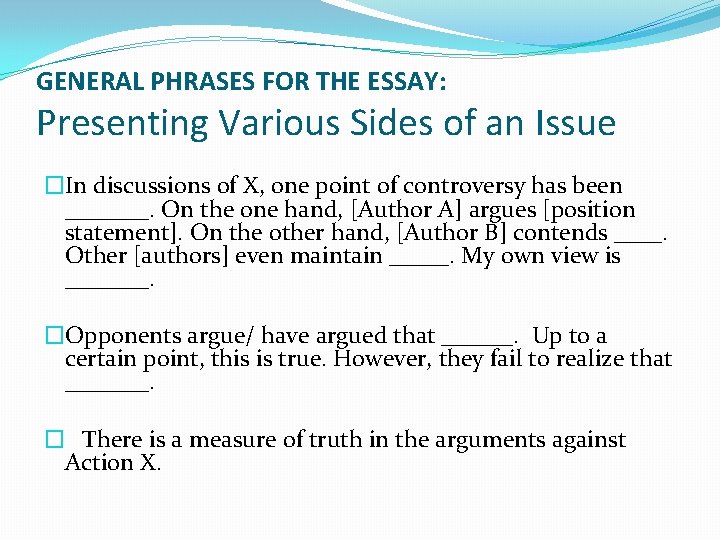 GENERAL PHRASES FOR THE ESSAY: Presenting Various Sides of an Issue �In discussions of X, one point of controversy has been _______. On the one hand, [Author A] argues [position statement]. On the other hand, [Author B] contends ____. Other [authors] even maintain _____. My own view is _______. �Opponents argue/ have argued that ______. Up to a certain point, this is true. However, they fail to realize that _______. � There is a measure of truth in the arguments against Action X.