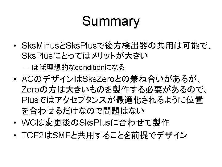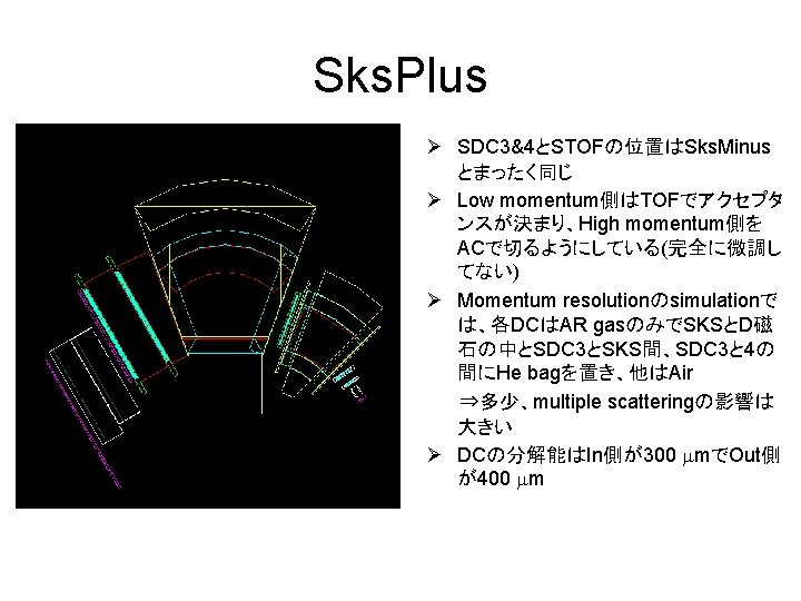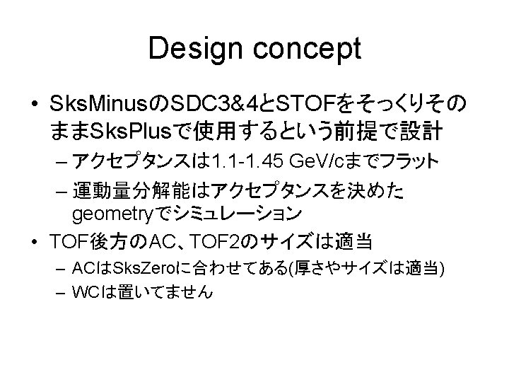 Simulation Results by T. Takahashi Sks. Plus acceptance Momentum resolution アクセプタンスは 40 msrに増加 Ø 1. 2 Ge. V/c以下にも欲しい Ø High momentumのprotonをトリガーに入れたくな いので 1. 5 Ge. V/c以上は切りたい
