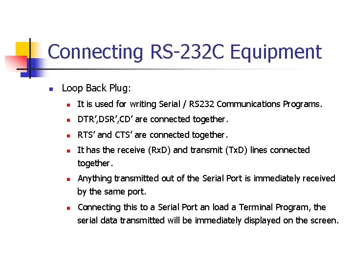 Connecting RS-232 C Equipment n Loop Back Plug: n It is used for writing Serial / RS 232 Communications Programs. n DTR’, DSR’, CD’ are connected together. n RTS’ and CTS’ are connected together. n n n It has the receive (Rx. D) and transmit (Tx. D) lines connected together. Anything transmitted out of the Serial Port is immediately received by the same port. Connecting this to a Serial Port an load a Terminal Program, the serial data transmitted will be immediately displayed on the screen.