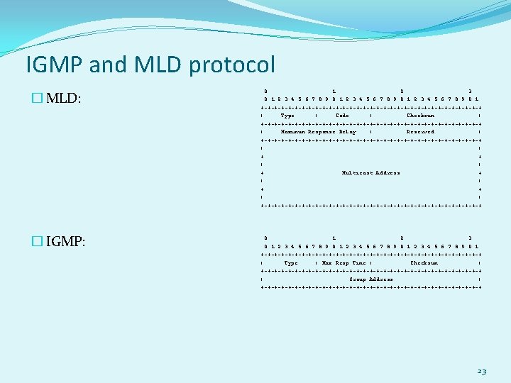 MLD protocol � Basically it's a multicast protocol for IPv 6 and has the same functionality as IGMP 22