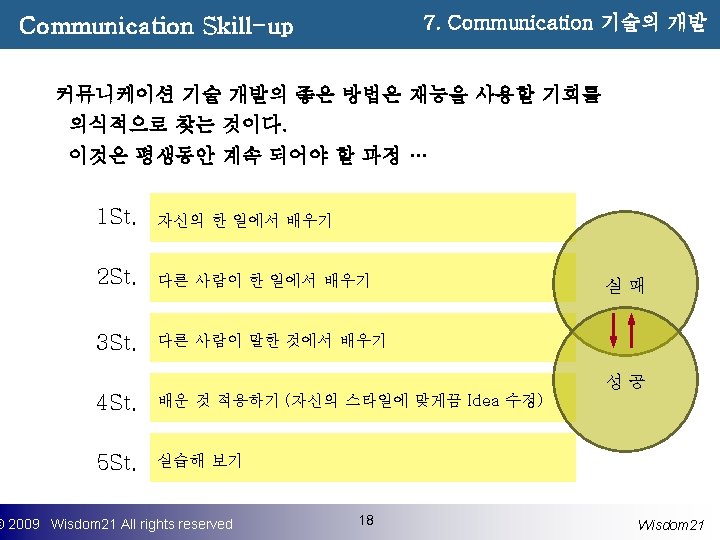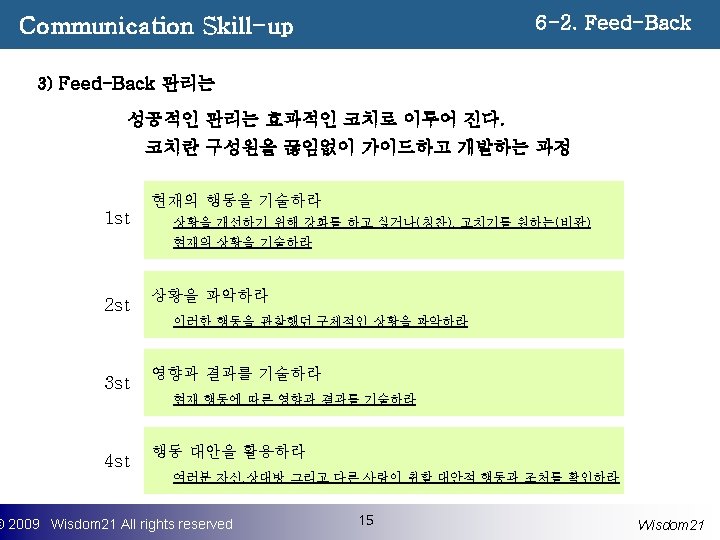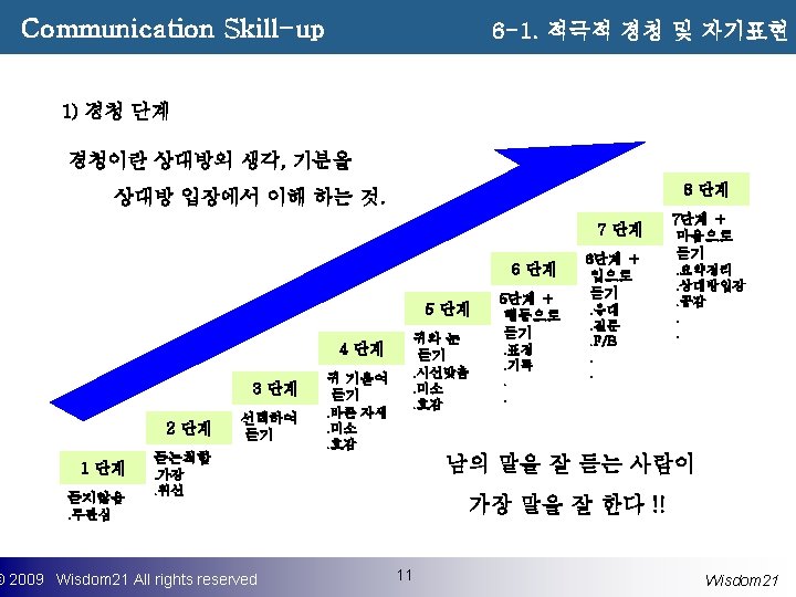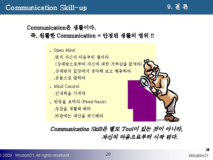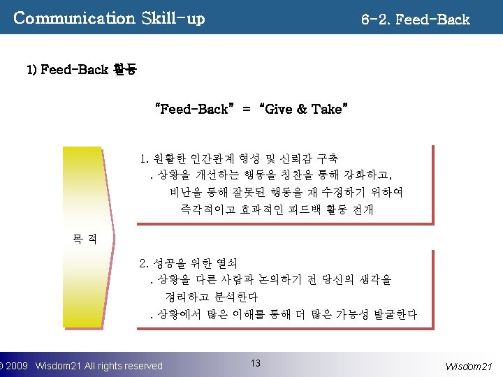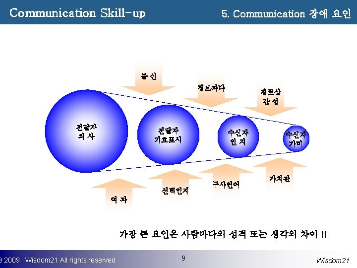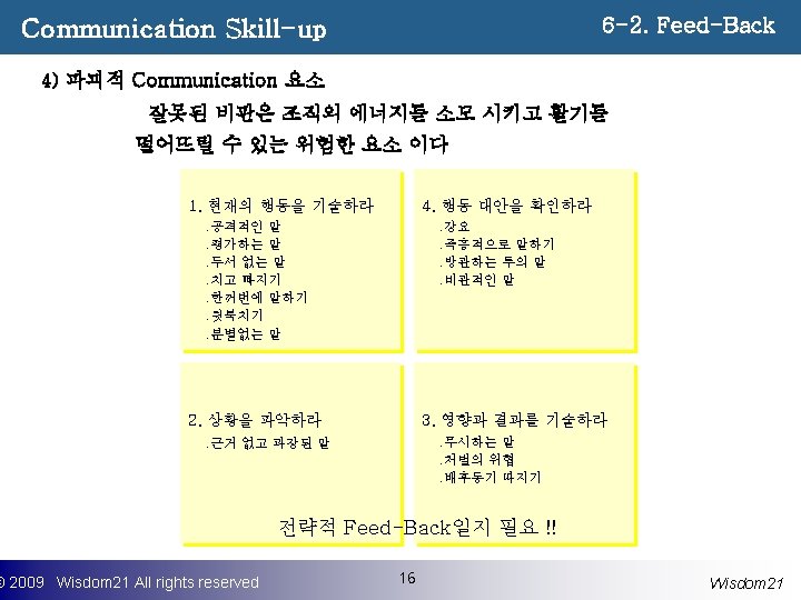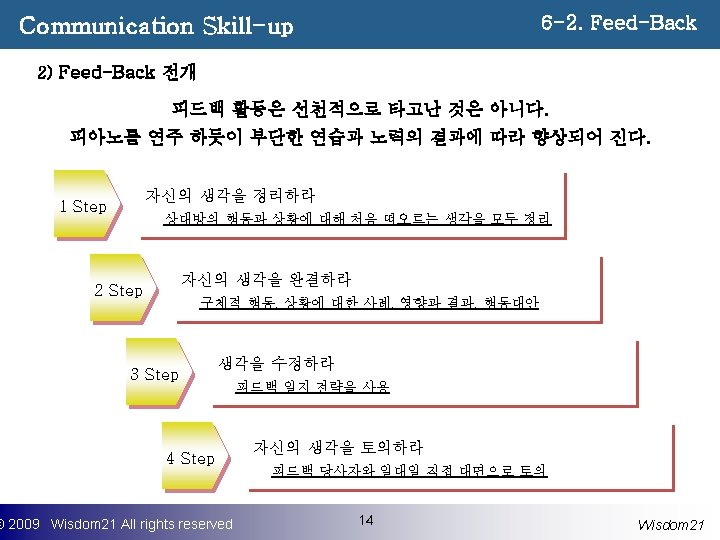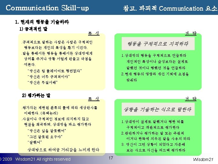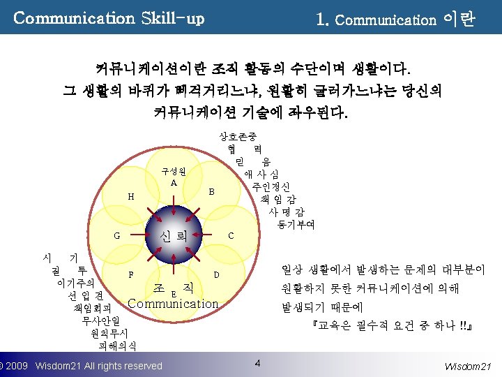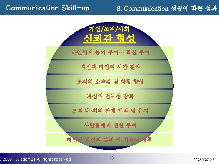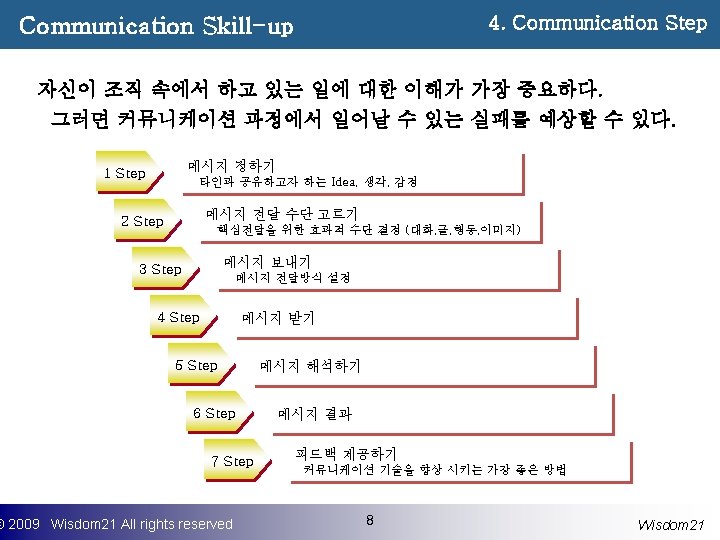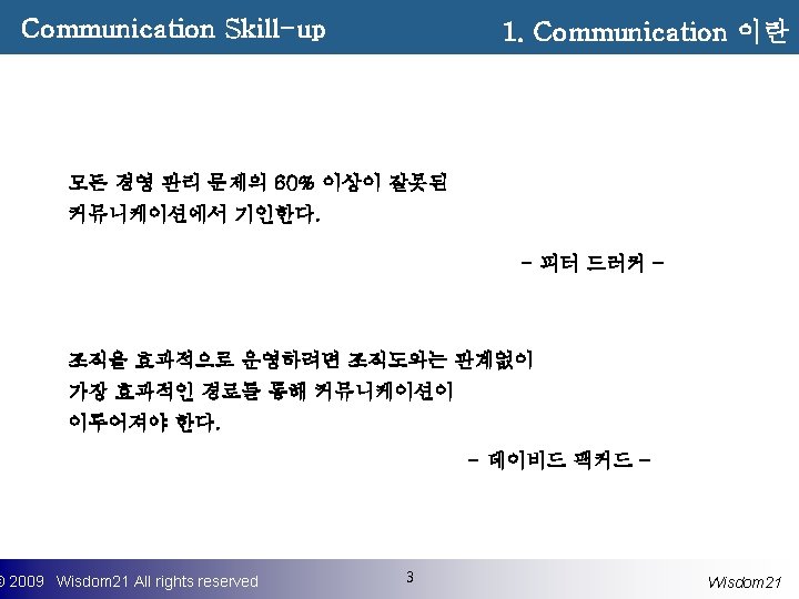 Communication Skillup Wisdom 21 Management Consulting www wisdom Slides: 22 Download presentation Communication Skill-up Wisdom 21 Management Consulting www. wisdom 21. co. kr 목 차 1. Communication 이란 2. Communication의 방법 3. Communication의 원칙 4. Communication 과정 5. Communication 장애요인 6. 효과적 Communication 7. Communication 기술의 개발 8. Communication 성공에 따른 성과 9. 결 론 © 2009 Wisdom 21 All rights reserved 2 Wisdom 21 Communication Skill-up 2. Communication의 방법 두 사람 또는 그 이상의 사람 사이에서 정보가 교환되고 공동의 이해가 되게끔 하는 모든 수단과 방법… ◈ 의사 소통의 구분 。Written Communication 。Oral Communication 。Non-verbal Communication - human element (인간적 요소: 얼굴 표정, 행동) - environment element (환경적 요소: 시간. 장소) ◈ 조직 내 의사 소통의 구분 。Formal Communication (공식적: 업무) 。Informal Communication (비공식적: 취미 생활) © 2009 Wisdom 21 All rights reserved 5 Wisdom 21 Communication Skill-up 3. Communication의 원칙 조직 속에서 원활한 커뮤니케이션을 위해서는 … 1 원칙. Speaking을 위해서는 우선 Active Listening. 간단 명료하게. 강조점의 부각 2 원칙. Two Way : Feed-back 3 원칙. 온몸으로 말한다 (Body Language) © 2009 Wisdom 21 All rights reserved 6 Wisdom 21 Communication Skill-up Communication 실습 Best / Worst Communicator 1. 자신의 주변에 있는 인물 중에서 Best / Worst Communicator를 각각 3명씩 선정한다. 2. 선정한 Best Communicator가 가지고 있는 공통적인 특징을 열거한다. 3. 선정한 Worst Communicator가 가지고 있는 공통적인 문제점을 열거한다. © 2009 Wisdom 21 All rights reserved 7 Wisdom 21 Communication Skill-up 6. 효과적 Communication 효과적인 Communication을 위해서는 。적극적 경청 및 자기 표현 。피드백 。감정의 억제 。명쾌한 언어구사 © 2009 Wisdom 21 All rights reserved 10 Wisdom 21 21세기 기업경영의 마르지 않는 샘 물 위즈덤 21의 정보 자료입니다. Wisdom 21 Management Consulting Business Introduction 감사합니다 우리는 귀사의 미래와 함께 하길 원합니다. © 2009 Wisdom 21 All rights reserved 주식회사 위즈덤 21 TEL : 02) 723 – 1566 (代) FAX : 02) 723 -1569 www. wisdom 21. co. kr 22 Wisdom 21